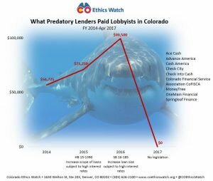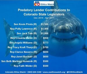One year after Ethics Watch published its Shark Attack report on predatory lender spending on Colorado politics, the industry has significantly reduced its profile. With no bills affecting the industry on this year’s legislative agenda, industry participants do not appear to have spent any money on lobbying as of the April 15 reporting deadline. Political contributions were also down during the 2016 election cycle, with only about $13,000 spent by industry participants.